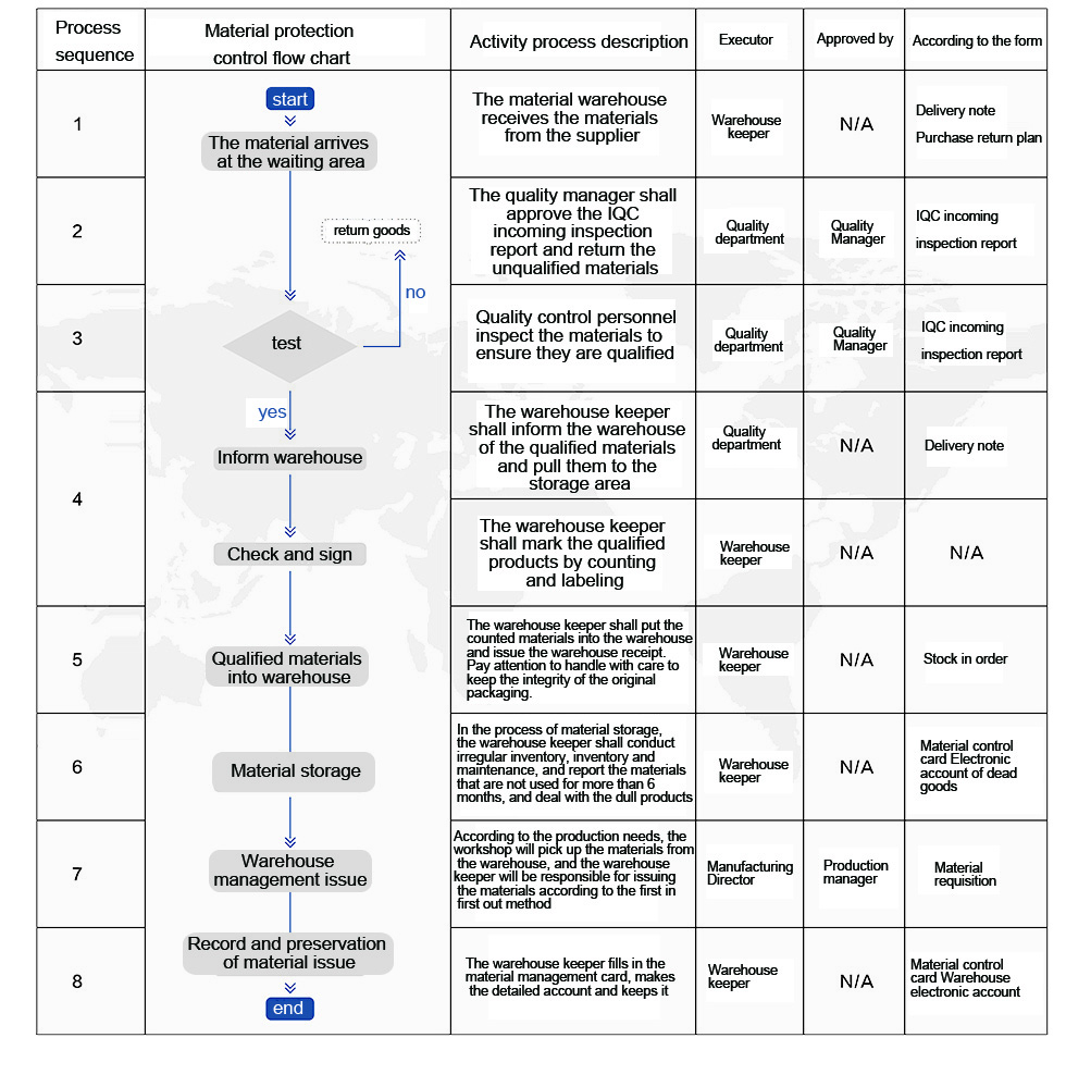 The material warehouse receives the material sent by the supplier, and the quality manager approves the IQC incoming material inspection report. If the unqualified material is returned, the workshop will collect the material from the warehouse according t